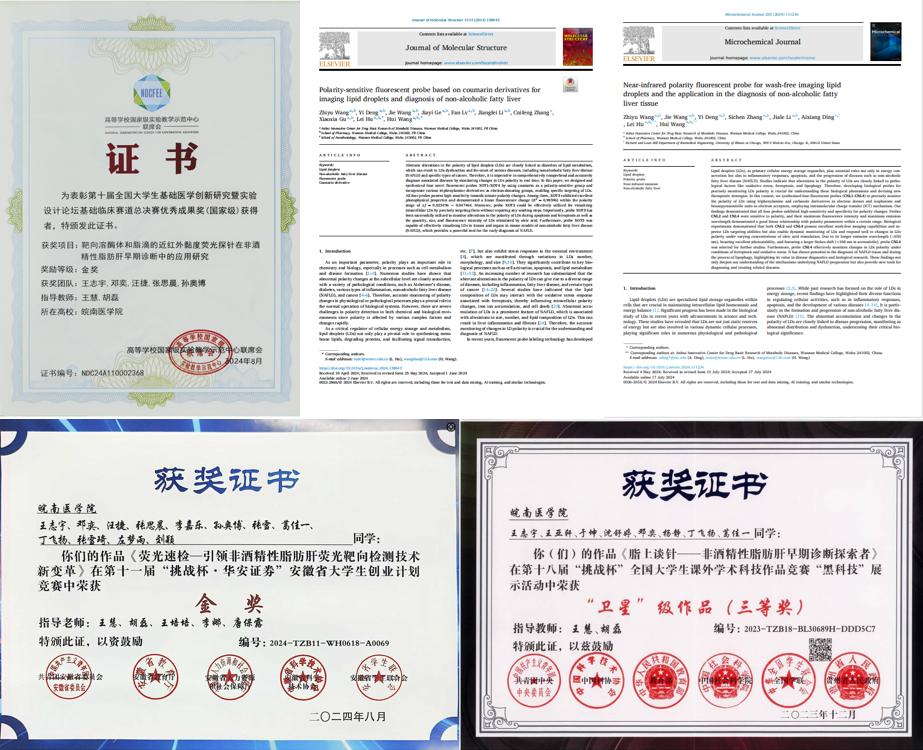 寒来暑往,王志宇不懈奋进,针对脂滴、溶酶体等亚细胞器,从极性、黏度等多个角度出发,通过分子的电子云计算与结构改进,成功设计合成了多种超灵敏并且具有大斯托克斯位移的近红外荧光探针,可精准靶向相应细胞器,并应用于小鼠肿瘤及非酒精性脂肪肝病的活体成像。他主持省级大学生创新创业训练计划1项、参与2项,参与校级科研项目2项,以第一作者或共同第一作者身份发表学术论文10篇,其中SCI 6篇 (中科院二区5篇),中文期刊4篇。他在医学科研的浩瀚星空中崭露头角,散发着属于自己的光芒,以坚定的步伐在科研之路上稳步前行。