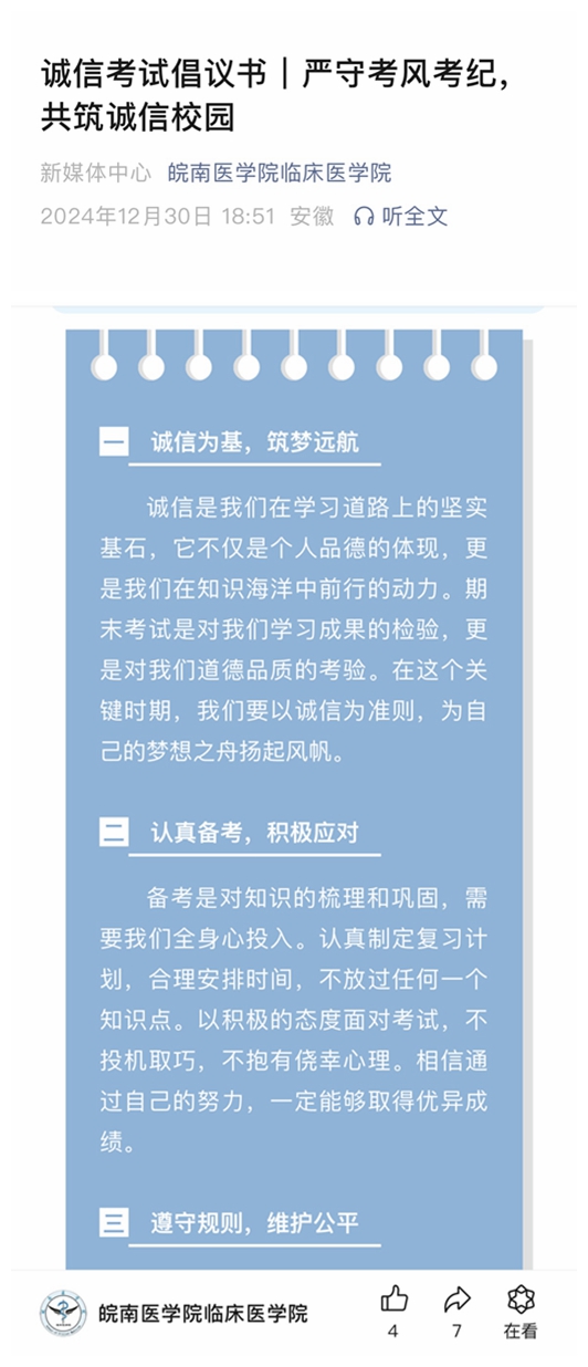 推文提醒,点亮诚信之光。学院及年级通过微信公众号、辅导猫、QQ等平台,开展线上专题教育,发布诚信考试温馨提示及倡议书,帮助同学们提高思想认识,端正考试态度,营造公平、公正的期末考试氛围。