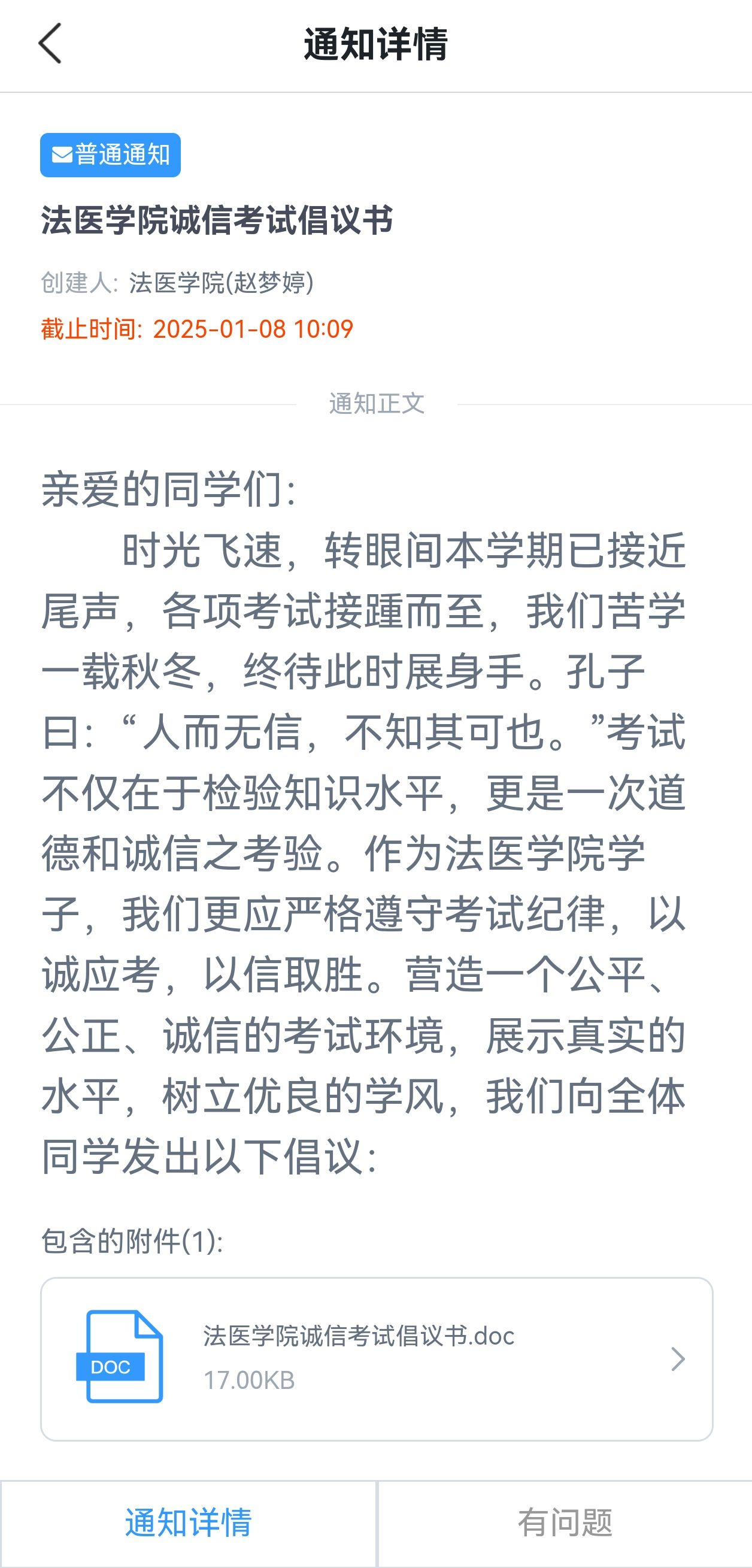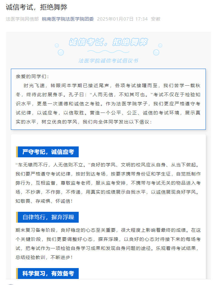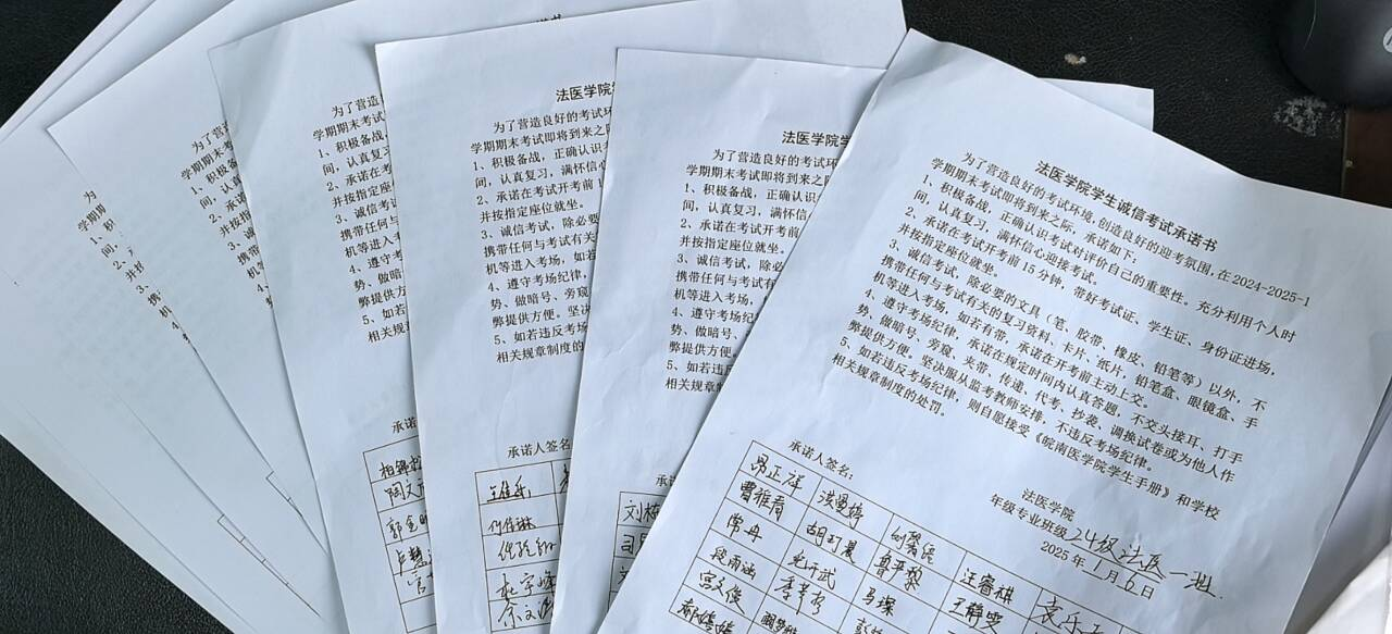 为进一步加强学风建设,严肃考试纪律,增强诚信意识,近期,法医学院开展以“诚信考试  从我做起”为主题的考风考纪教育活动,旨在营造风清气正的考试环境和积极向上的良好学风。