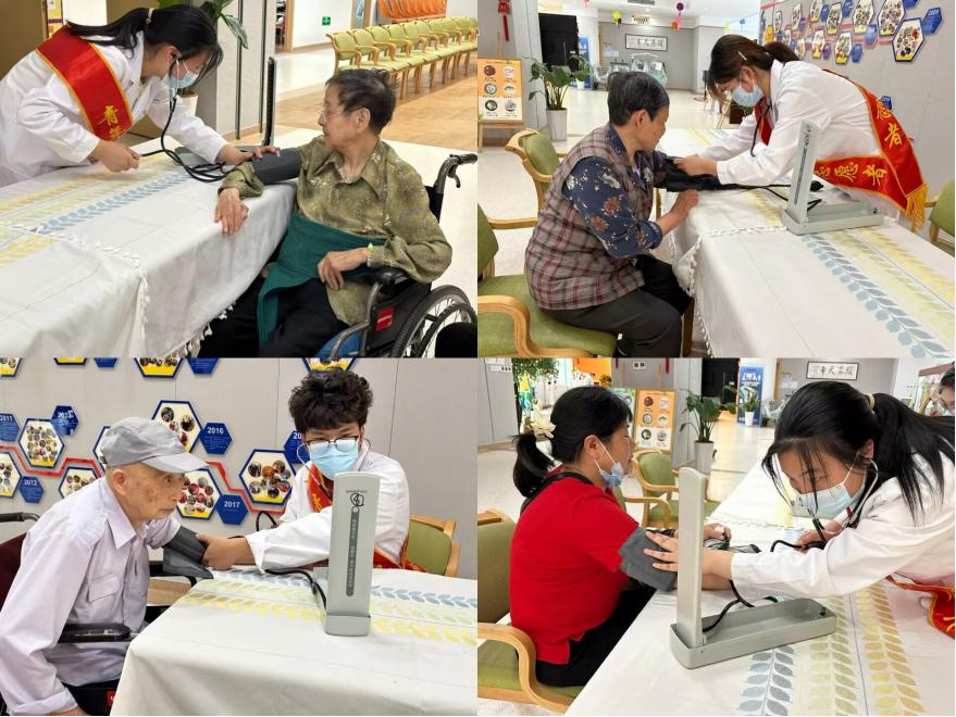 医疗服务进颐养,健康检测暖夕阳。身着白大褂的医学生志愿者将课堂所学转化为实践关怀,为长者开展系统化健康监测。血压测量区,志愿者精准记录数值并生成个性化健康建议单;中医养生角,夏季防暑穴位图解搭配草本香囊制作,让“未病先防”理念浸润心田。