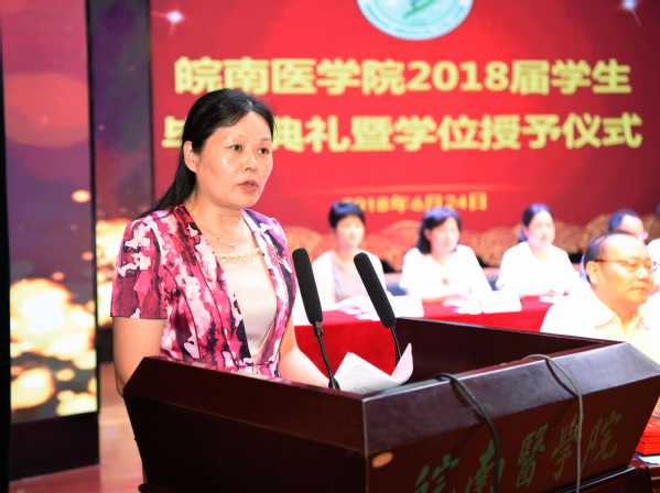 教师代表、药学院化学教研室吴运军教授对同学们表达了殷切期望,希望同学们牢记皖医精神,甘于寂寞,学会独立思考;坚守理想,敢于追求人生幸福;为人谦和,学会理解、感恩和坚强。重症护理学专业孙盼盼同学、临床医学专业庄晓鹏同学分别代表研究生和本专科毕业生发言,表达了对母校的诚挚谢意和惜别之情,表示将谨记母校校训,继承和发扬皖医精神,脚踏实地,敢于担当,奉献社会,在逐梦路上奋发向上、永不言弃,展现皖医人的风采。
