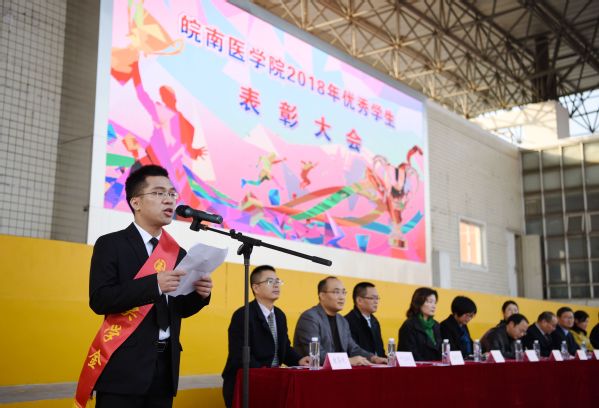 副院长吴金月讲话。他首先向受到表彰的先进个人和先进集体表示热烈祝贺,向辛勤耕耘在教育教学一线的全体老师和辅导员致以崇高的敬意和衷心的感谢。他指出,表彰大会既是学生奋发向上、积极进取精神风貌的集中展示,也是学校大力推进教育教学改革、不断加强人才培养工作成果的一次检阅,希望受表彰的个人和集体再接再厉,再创佳绩;未受表彰的个人和集体要自觉向先进和优秀看齐,争取后来居上。他对全体同学提出殷切希望,一是要勇担责任,立志报国。希望同学们明白,“青年有责任,国家才有希望”,“得其大者可以兼其小”,要秉承“精医、尚德、求实、自强”的校训,发扬“艰苦创业、求实自强、奉献社会”的皖医精神,把人生理想融入国家和民族的伟大梦想,在推动国家发展和社会进步的实践中实现个人价值。二是要努力读书,刻苦学习。同学们要始终把读书学习作为首要任务,作为一种责任、一种精神追求、一种生活方式。学习没有捷径可走,贵在勤奋、贵在钻研、贵在有恒。三是要百尺竿头,更进一步。大学之大,在于大师之大;大学之优,在于学生之优。同学们要用更高的眼光审视自己,要把已有的成绩作为新的起点,把获得的荣誉化为向更高目标迈进的动力,向更高标准看齐,更高目标迈进,努力成为社会精英、国之栋梁。
