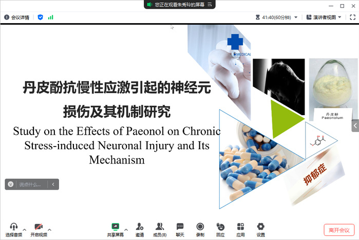 朱秀玲以“丹皮酚抗慢性应激引起的神经元损伤及其机制研究”为题,结合自己的研究成果作报告。她指出,丹皮酚可能通过影响脑源性神经营养因子(BDNF)和其TrkB受体,调节RhoGTP酶和cofilin1等信号分子,参与抵抗慢性应激引起的神经树突棘和树突萎缩。Paeonol活化cofilin1,影响肌动蛋白微丝结构,减少树突棘丢失和树突萎缩,改善actin重塑,促进突触重塑,从而缓解行为损伤。本次讲座内容丰富、语言生动,给与会人员留下了深刻印象。