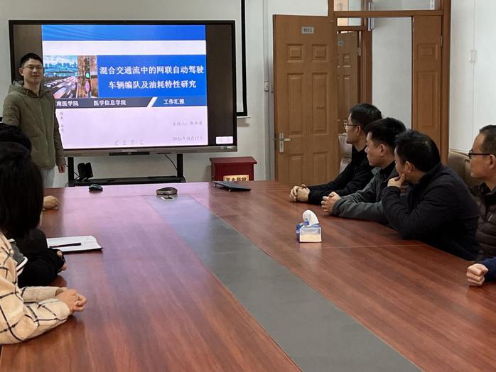 张延涛博士以“混合交通流中的网联自动驾驶车辆编队及油耗特性研究”为题作报告。他结合自身科研工作实践,阐述了网联自动驾驶车辆编队行驶在交通系统中提高交通效率、节能减排的作用,并提出新的车辆编队方法。整场报告内容丰富、精彩生动。报告结束后,张延涛博士与参会老师进行了深入讨论。