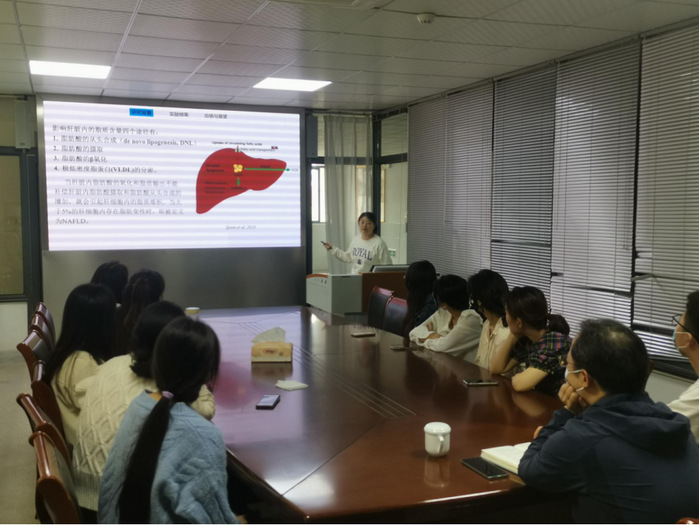 梁娟娟博士以“L-茶氨酸抑制非酒精性脂肪肝病的分子机制研究”为题作学术报告。她指出,随着人们生活水平的提高以及饮食方式的改变,非酒精性脂肪肝病在中国以及全世界的发病率越来越高。一种存在于绿茶中的天然化合物L-茶氨酸可以通过CaMKKβ-AMPK信号通路调控肝脏内的脂质代谢。L-茶氨酸可抑制脂肪酸的合成,从源头上减少肝内脂质的含量,同时促进脂肪酸的β氧化而加快脂质清除,从而减少肝内的脂质沉积,抑制非酒精性脂肪肝病的进展。该研究证实了L-茶氨酸具有治疗非酒精性脂肪肝病的功效,并初步探究了相关分子机制。整场报告思路清晰,精彩生动。报告结束后,梁娟娟博士与参会老师进行了热烈交流和讨论。