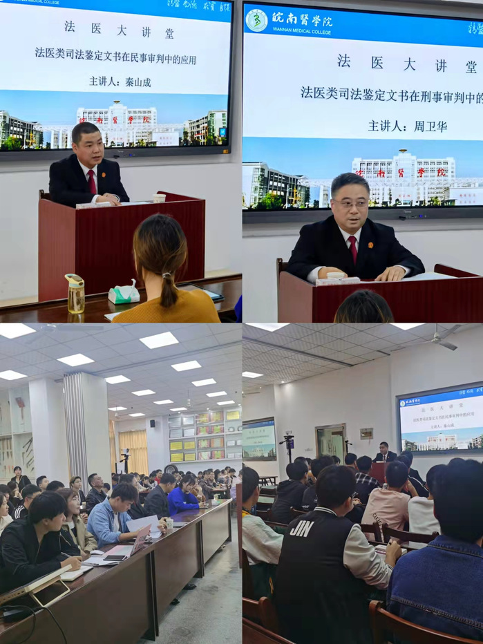 为扎实推进“我为群众办实事 我为发展作贡献”实践活动,提升学生鉴定文书规范书写能力,拓展师生学术视野,法医学院于10月27日在学院大教室邀请芜湖市镜湖区人民法院周卫华和秦山成两位法官举办“法医大讲堂”系列讲座,学院领导、教研室主任、青年教师及各年级学生代表参加。