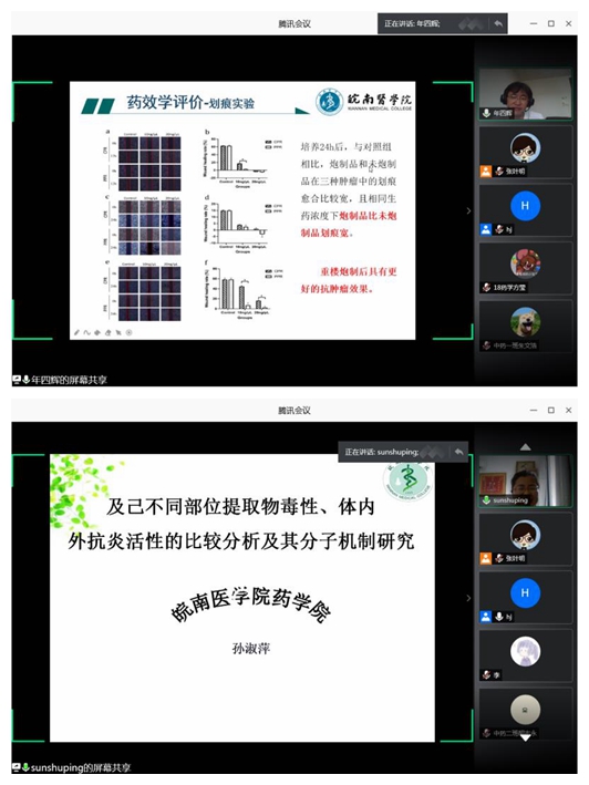 2020年7月10日下午,我校博士论坛第三十七讲通过“腾讯会议”云端开讲,药学院年四辉博士、孙淑萍博士分别作了题为“石灰水炮制对重楼皂苷类组分的转化及机制”、“及己不同部位提取物毒性、体内外抗炎活性的比较分析及其分子机制研究”的专题报告,150余名师生参加了本次“跨越时空”的学术论坛,报告由药学院院长韩军主持。