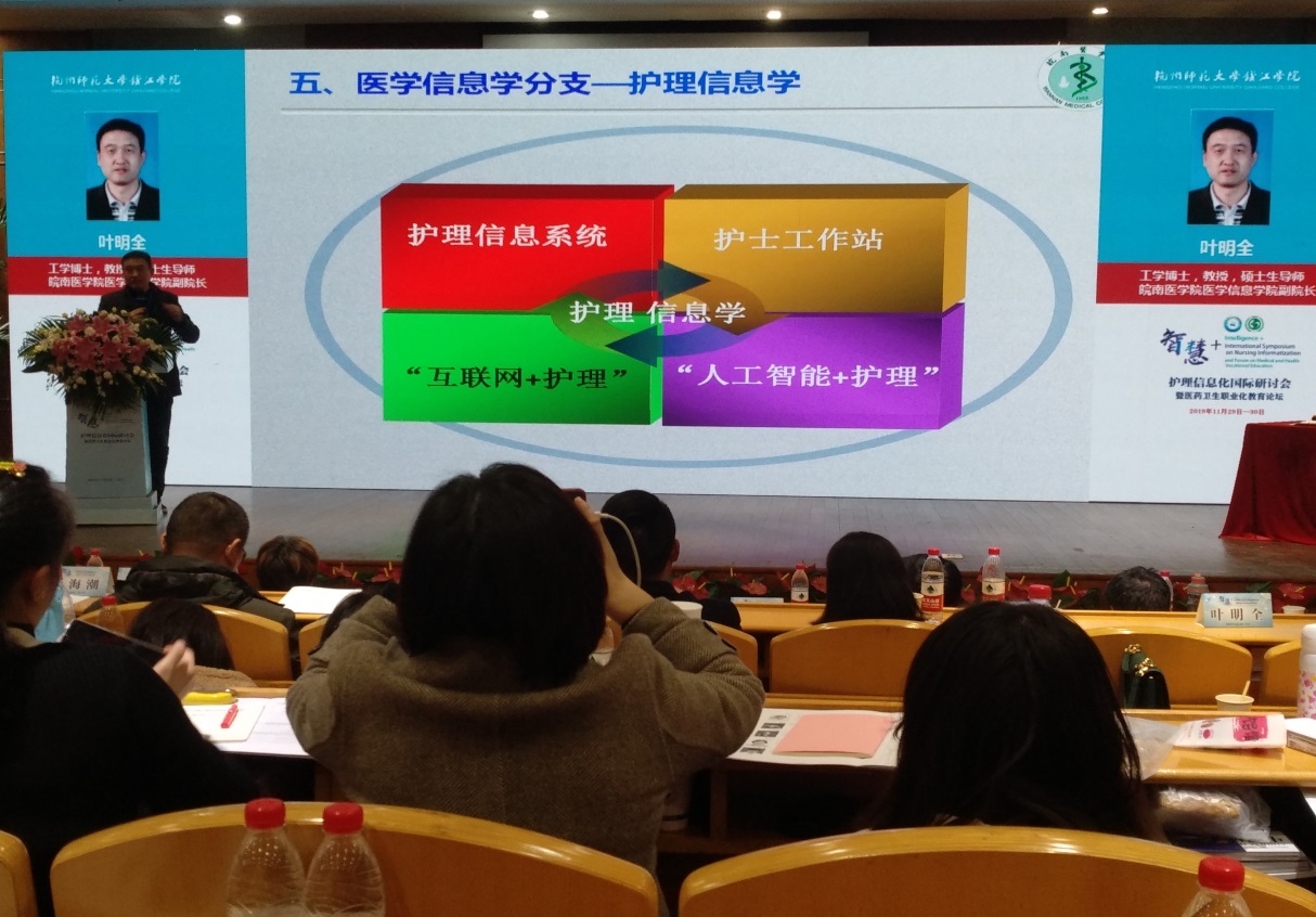 为探讨“互联网+医疗健康”新时代护理信息化人才队伍建设和护理人员信息化素养培养,11月28日-30日,护理学院院长李远珍、医学信息学院副院长叶明全等一行4人,参加由杭州师范大学钱江学院和中国医药教育协会共同主办、浙江大学出版社承办的“智慧+护理信息化国际研讨会暨医药卫生职业化教育论坛”。会议吸引了来自北京大学、首都医科大学等20余所高校、30余家医院和医疗IT企业近200名嘉宾和国内外资深护理信息化专家参会。