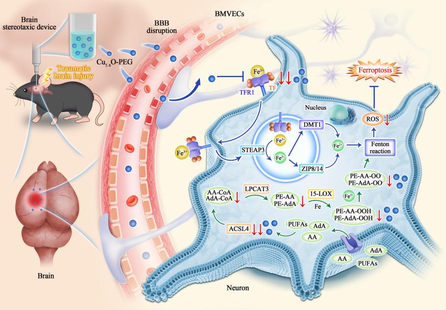 创伤性脑损伤(TBI)常伴有认知功能障碍的发生,是全球主要的健康问题。前期研究表明,认知功能障碍患者脑中普遍存在铁代谢异常,其脑铁含量升高与认知衰退有相关性,铁死亡可能是TBI后认知功能障碍的重要机制,同时,TBI伴有神经炎症和神经元损伤。目前仍缺乏安全有效的治疗措施,未能解决铁死亡、氧化应激和炎症等关键病理机制,突显了多功能新型治疗的必要性。基于以上问题,研究团队制备了一种具有血脑屏障渗透性和生物相容性良好的铜基纳米酶材料——聚乙二醇修饰的Cu5.4O(Cu5.4O-PEG)。研究发现,Cu5.4O-PEG在体外与体内均发挥抗氧化和抑制铁死亡的作用,Cu5.4O-PEG可减轻小鼠TBI引起的运动和认知功能障碍。该研究为脑外伤的治疗与功能评估提供了新的视角和思路。